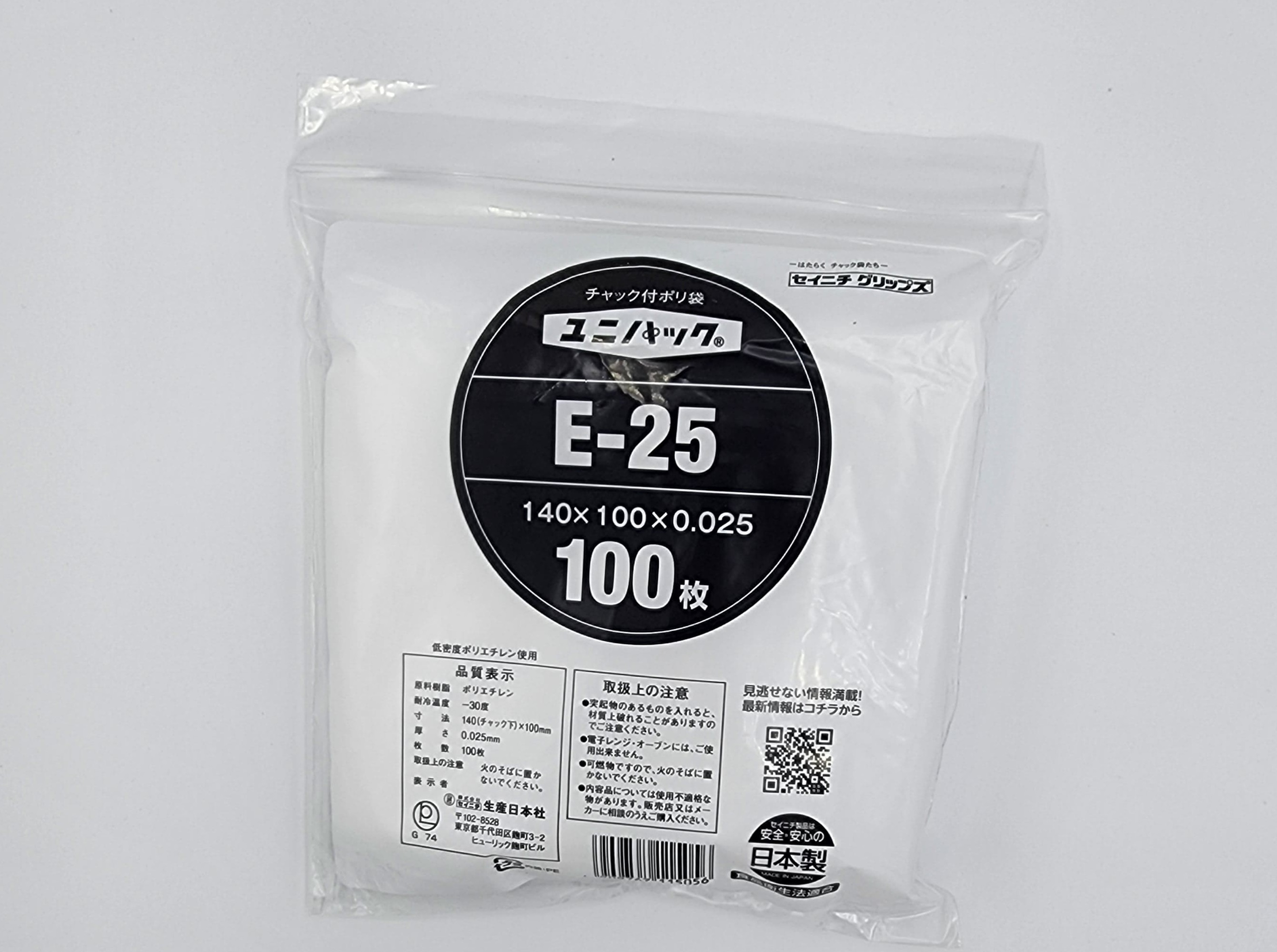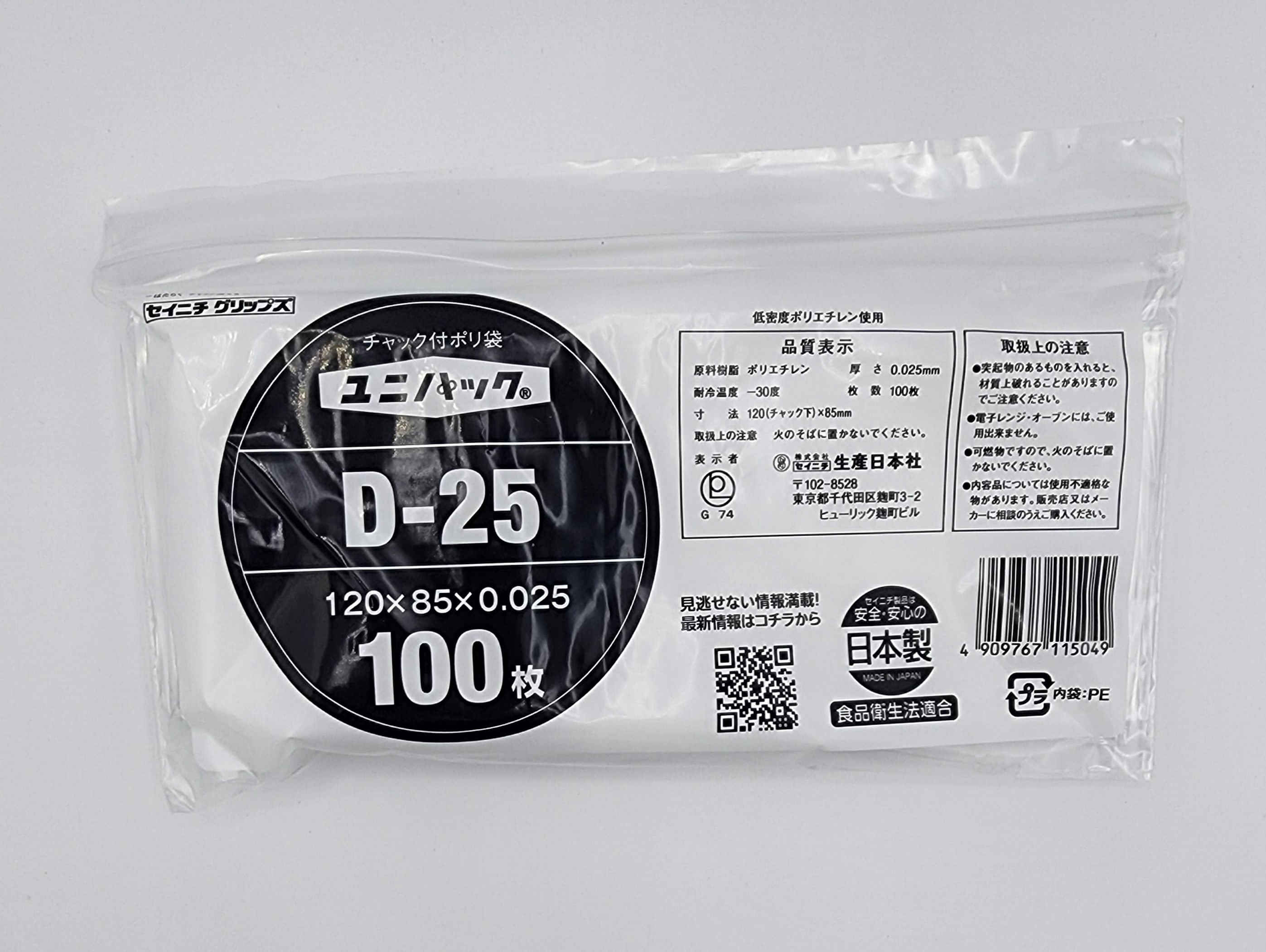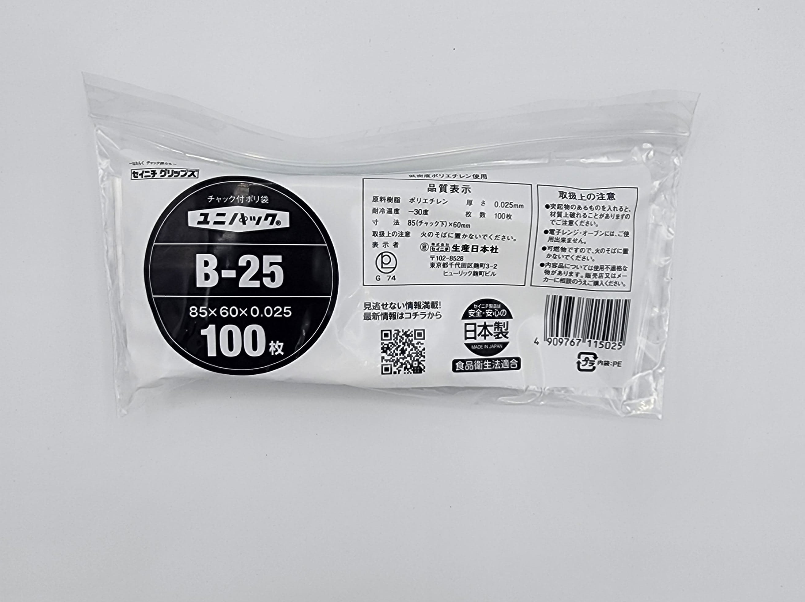 ユニパック25は、チャック付ポリ袋の0.025mm薄口タイプです。
