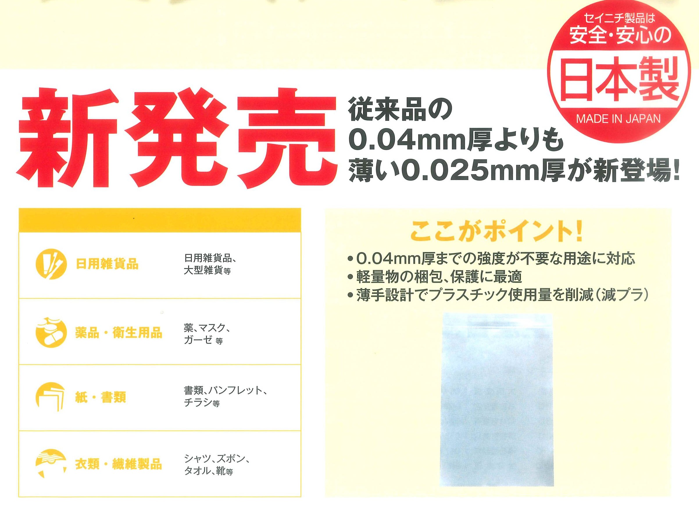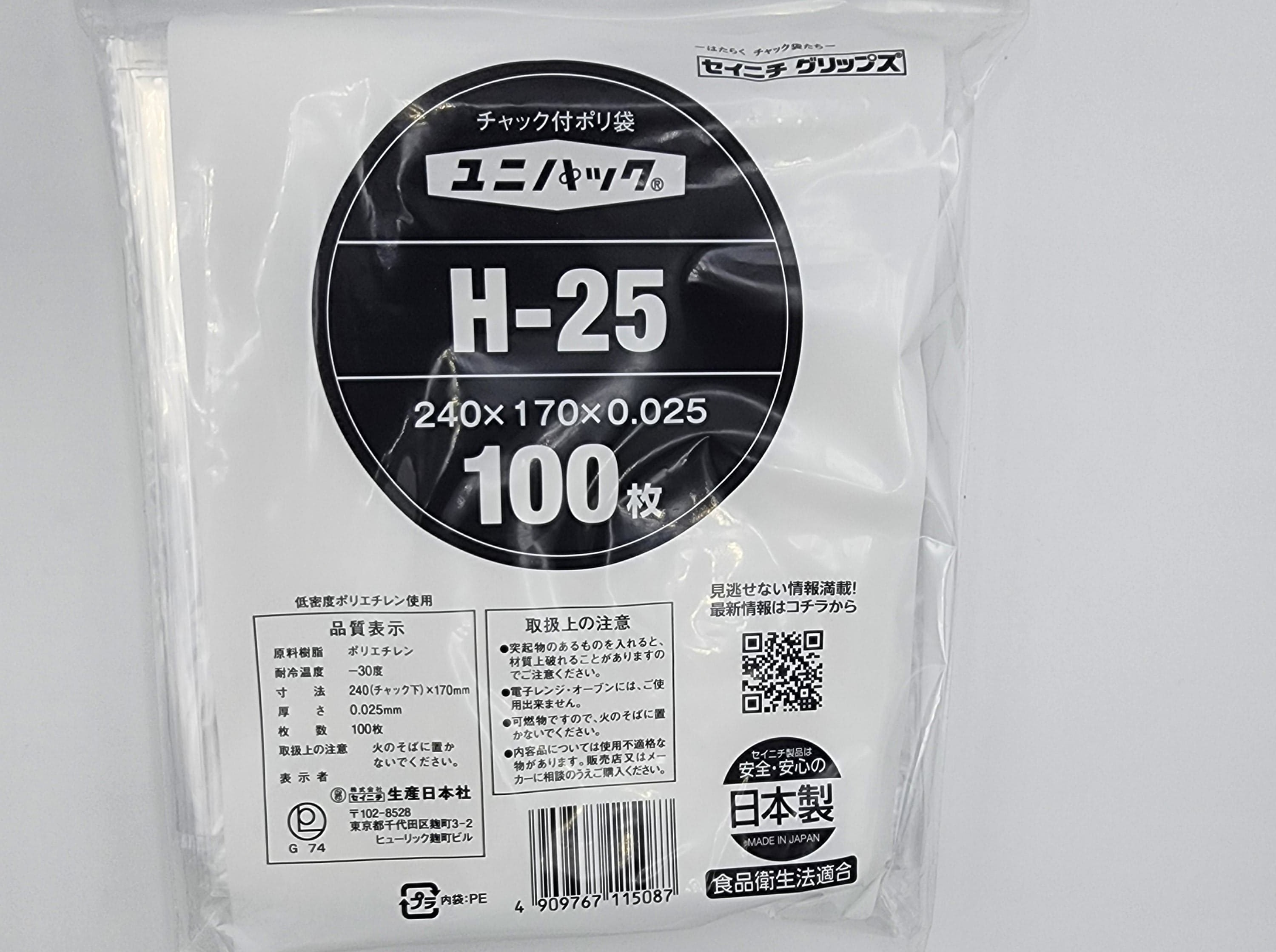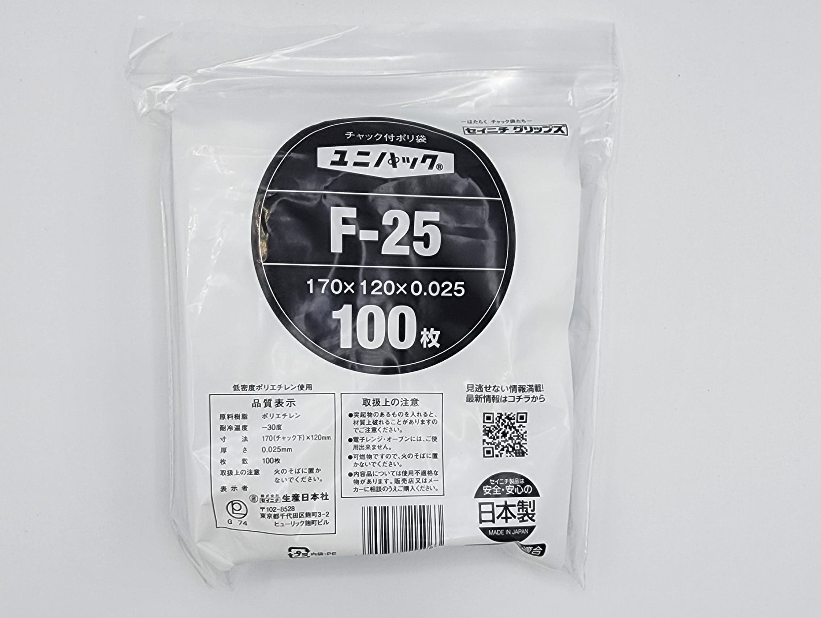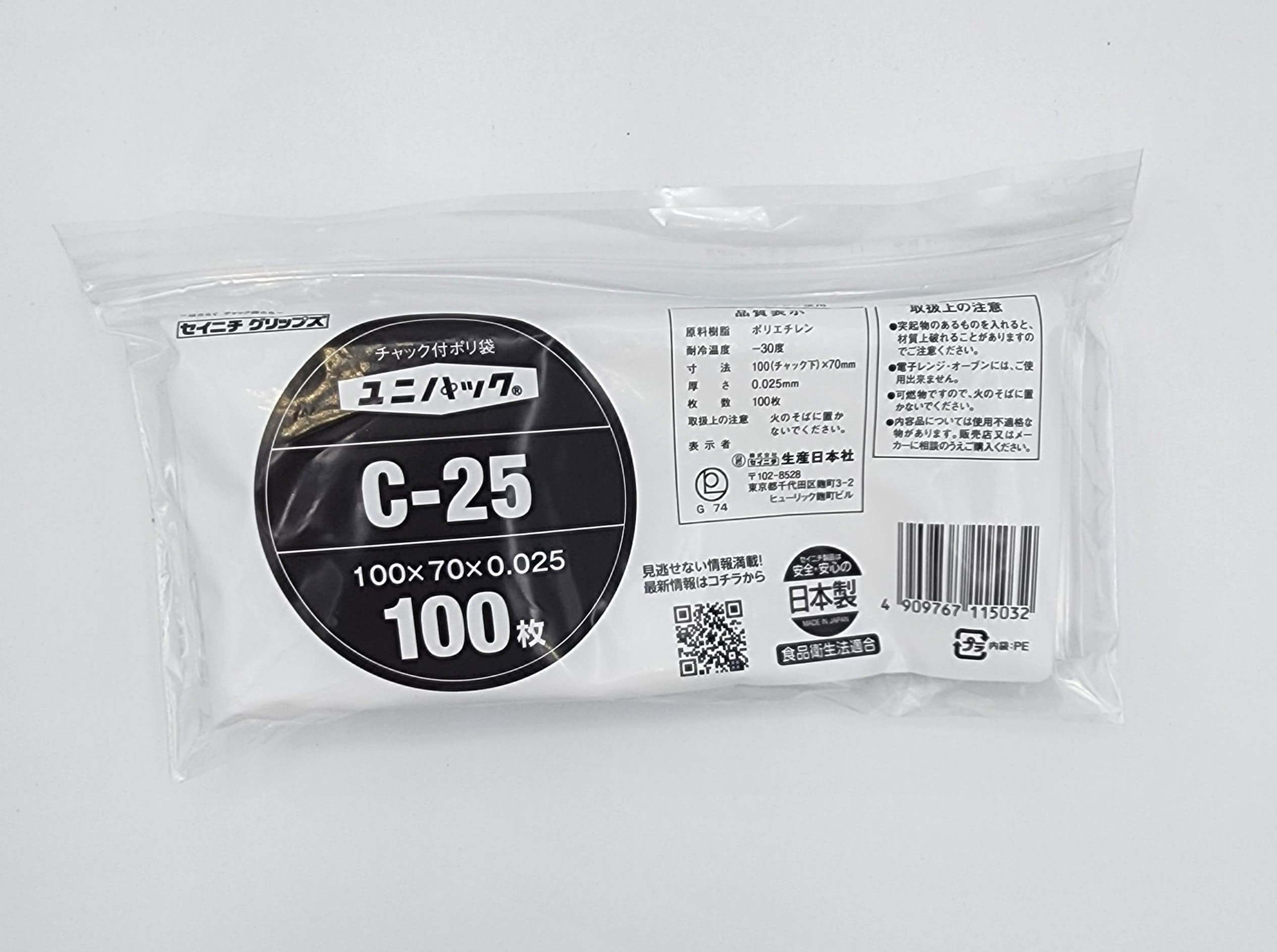 ユニパック25は、チャック付ポリ袋の0.025mm薄口タイプです。